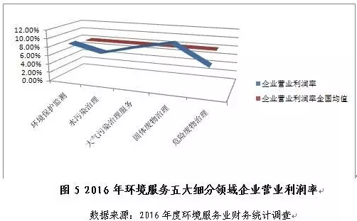 從盈利情況看,環(huán)境保護(hù)監(jiān)測(cè)、水污染治理、大氣污染治理、固體廢物治理和危險(xiǎn)廢物治理五大細(xì)分領(lǐng)域中,僅固體廢物治理和危險(xiǎn)廢物治理領(lǐng)域的2016年?duì)I業(yè)利潤(rùn)率較2015年有所提高,固體廢物治理領(lǐng)域以10.4%的營(yíng)業(yè)利潤(rùn)率成為五領(lǐng)域中盈利能力最高的細(xì)分行業(yè),危險(xiǎn)廢物治理領(lǐng)域營(yíng)業(yè)利潤(rùn)率同比增幅最高,約94.2%;環(huán)境保護(hù)監(jiān)測(cè)、大氣污染治理和水污染治理三領(lǐng)域的2016年?duì)I業(yè)利潤(rùn)率同比分別下滑18.9%、11.3%和9.0%。