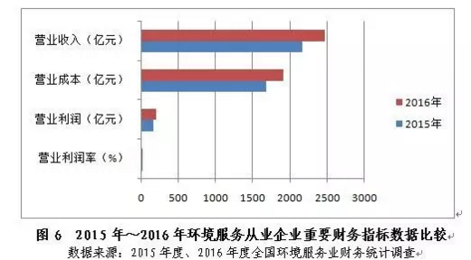 環(huán)境服務(wù)從業(yè)企業(yè)(以執(zhí)行的會(huì)計(jì)制度劃分)營(yíng)業(yè)收入以高于行業(yè)整體年均漲幅0.4個(gè)百分點(diǎn)的增速實(shí)現(xiàn)收入的持續(xù)拉升,占年收入總額的比重由2015年的92.4%小幅升至2016年的92.7%,2016年達(dá)2469.5億元,同比增長(zhǎng)14.2%,實(shí)現(xiàn)營(yíng)業(yè)利潤(rùn)額194.2億元,同比上漲20.6%。由于勞動(dòng)力成本、原材料價(jià)格、融資成本漲幅總體溫和,2016年企業(yè)營(yíng)業(yè)成本同比增幅約13.6%,略低于營(yíng)業(yè)收入同比增速,行業(yè)營(yíng)業(yè)利潤(rùn)率從2015年的7.4%小幅升至2016年的7.9%。