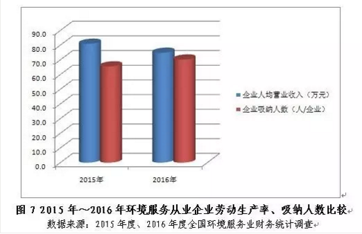 2016年,環(huán)境服務(wù)從業(yè)企業(yè)人均營(yíng)業(yè)收入74.8萬元,同比下跌7.5%。從業(yè)企業(yè)勞動(dòng)生產(chǎn)率的小幅下滑可能與企業(yè)吸納從業(yè)人數(shù)的增長(zhǎng)有關(guān),2016年業(yè)內(nèi)企業(yè)平均吸納人數(shù)為70人/企業(yè),同比提高7.2%。