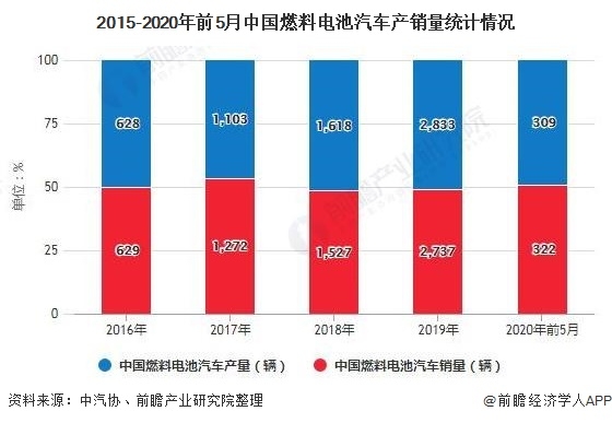 中汽協(xié)數(shù)據(jù)顯示,燃料電池汽車產(chǎn)銷分別完成2833輛和2737輛,同比分別增長85.5%和79.2%。從2016年到2019年,國內(nèi)燃料電池汽車銷量逐年增加。或受到疫情影響,截止至2020年1-5月中國燃料電池汽車產(chǎn)銷分別完成309輛和322輛,同比分別下降44.1%和40.9%。