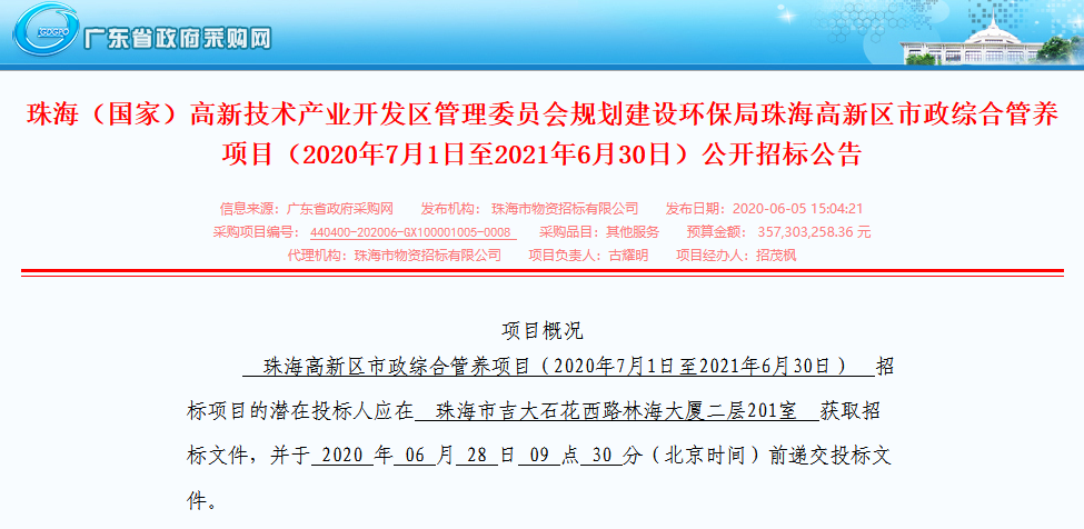 按照開標(biāo)計(jì)劃,6月28日,采購(gòu)預(yù)算高達(dá)357,303,258.36元/年的珠海高新區(qū)市政綜合管養(yǎng)項(xiàng)目將公布中標(biāo)結(jié)果。