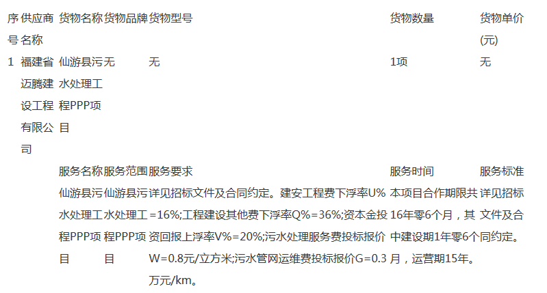 1、項目名稱:仙游縣污水處理工程PPP項目