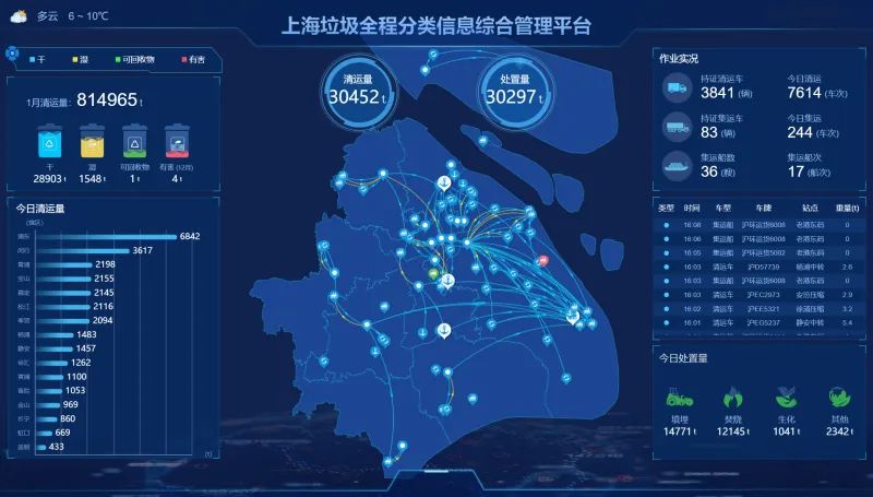 該平臺自2018年底建成投用,用真實數(shù)據(jù)實時繪制申城垃圾物流走向圖,實現(xiàn)數(shù)字化、可視化監(jiān)控,賦予生活垃圾“數(shù)字生命”。具體來說,垃圾產(chǎn)生的時間,從哪個轄區(qū)來的,哪輛車清運的,裝進(jìn)了哪個集裝箱,運到哪里處置,全部一清二楚。目前,該平臺已接入全市16個區(qū)的生活垃圾數(shù)據(jù),大大提升了分類實效。在智能化監(jiān)管之前,干濕垃圾比例是在9比1,現(xiàn)在已經(jīng)“逆襲”到6比4左右,這恰恰說明更多濕垃圾從干垃圾里分出來了,分類精度大幅躍升。