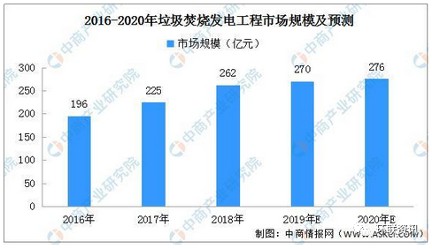 垃圾焚燒處理相較于衛(wèi)生填埋、堆肥等無害化處理方式具有處理效率高、減容效果好、資源可回收利用、對環(huán)境影響相對較小等優(yōu)勢,在國家政策的大力支持下,將成為垃圾處理行業(yè)的主流方式。在此背景下,垃圾焚燒發(fā)電行業(yè)快速發(fā)展,帶動產(chǎn)業(yè)鏈投資。2017年,我國垃圾焚燒發(fā)電工程市場規(guī)模超過200億元。隨著政策利好、城鎮(zhèn)化加快等因素影響,市場持續(xù)擴大。2019年中國垃圾焚燒發(fā)電工程市場規(guī)模約為270億元,預計2020年將進一步擴大至276億元。