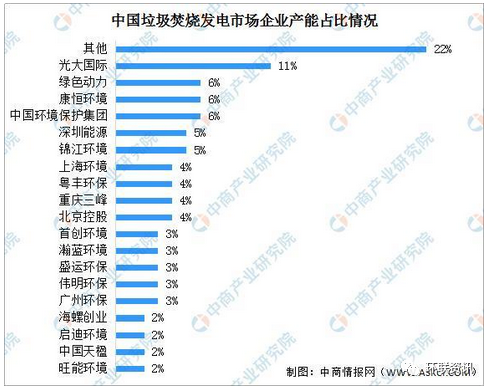 據(jù)統(tǒng)計,截至2019年底,我國垃圾焚燒發(fā)電市場中,企業(yè)在手產(chǎn)能占比最大的為光大國際,達到11%;其次為中國環(huán)境保護集團、康恒環(huán)境、綠色動力,均為6%;錦江環(huán)境、深圳能源占比均為5%。