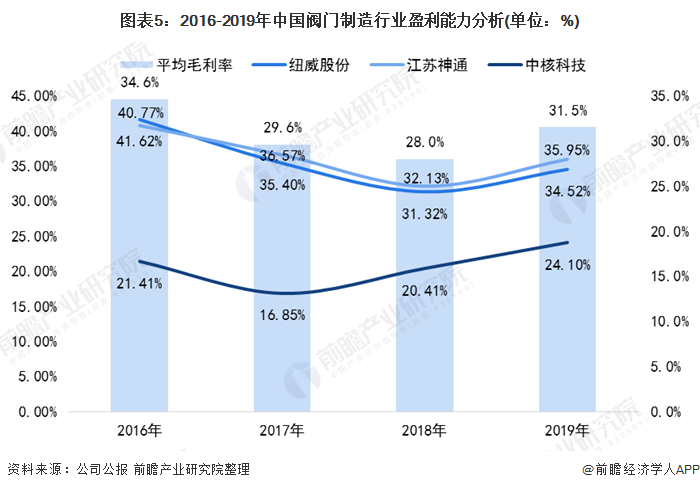 以紐威股份、江蘇神通、中核科技為例,計(jì)算我國(guó)閥門制造行業(yè)盈利能力情況。2016-2019年,我國(guó)閥門制造行業(yè)平均毛利率波動(dòng)變化。2019年,三家企業(yè)平均毛利率約為31.5%,其中,江蘇神通毛利率最高,為35.95%,其次為紐威股份,毛利率達(dá)34.52%。綜合來(lái)看,企業(yè)產(chǎn)品盈利性相對(duì)較高。