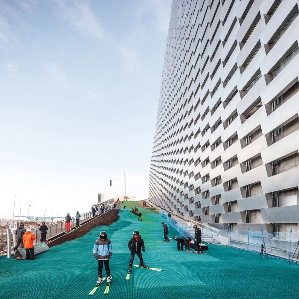 一座垃圾發(fā)電廠能改造出多少花頭,看完 CopenHill,真的被建筑師的腦洞驚艷到,400m 的屋頂滑雪場、公園步道、85m的人工攀巖墻、咖啡店、酒吧,每一處設(shè)計都在為當(dāng)?shù)厝嗣駧碜罘潘傻挠瓮骟w驗。從最受矚目的滑雪場說起,雖然丹麥氣候寒冷,但這里卻缺乏山脈,以前人們?yōu)榱嘶┲荒茯?qū)車幾百公里到瑞典滑雪。CopenHill 的出現(xiàn),讓哥本哈根擁有了第一個滑雪場不同于白雪皚皚的滑雪道,這個滑雪場放眼望去皆是綠色。這是一種特殊的合成材料,由一個個小的幾何單元構(gòu)成。