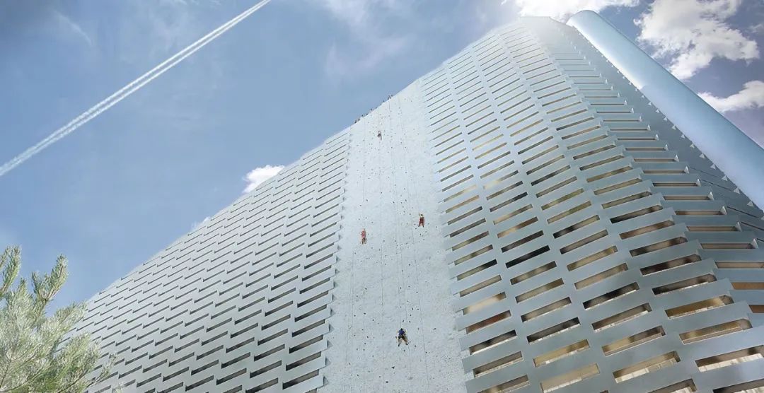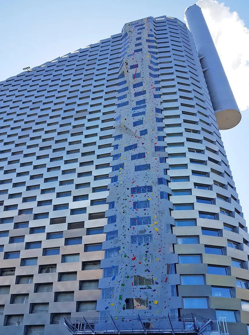 位于建筑的一側(cè),還有一個高 85m、寬 10m 的攀巖墻,它成功打破世界紀(jì)錄,成為最高的人工攀巖墻。它的設(shè)計類似于天然的山墻,用各種難度滿足不同程度攀巖者的需求。