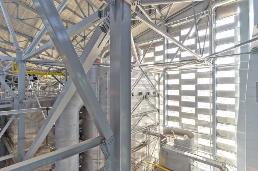 作為一座垃圾發(fā)電廠,它的外觀完全區(qū)別于我們的固有印象,124m 的高度,形狀如同一座傾斜的山坡,在陽光下閃閃發(fā)光。外立面由高 1.2m、寬 3.3m的鋁磚單元堆疊而成,玻璃窗鑲嵌其中,為建筑內(nèi)部也帶去了自然光線。