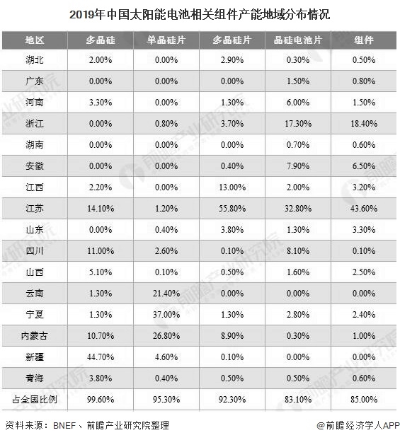 太陽能電池主要由多晶硅、單晶硅片、多晶硅片、晶硅電池片等組成,從區(qū)域分布來看,2019年我國太陽能電池相關(guān)組件的產(chǎn)能分布較為廣泛,多晶硅和硅片的產(chǎn)能主要集中在電價更低的西部地區(qū),尤其是新疆、四川、寧夏、云南等地。電池片和組件主要集中在東部地區(qū),如浙江和江蘇,兩者產(chǎn)能占全國產(chǎn)能比重超過60%。