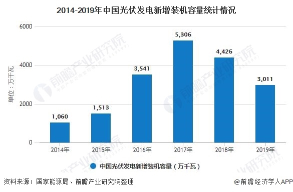 據(jù)國家能源局統(tǒng)計數(shù)據(jù)顯示,2017年,我國光伏發(fā)電新增裝機(jī)容量為5306萬千瓦,創(chuàng)歷史新高。2018年之后,受光伏531新政影響,各地光伏發(fā)電新增項目有所下滑。2019年,全國新增光伏發(fā)電裝機(jī)3011萬千瓦,同比下降31.6%。累計裝機(jī)容量已增長至20430萬千瓦。