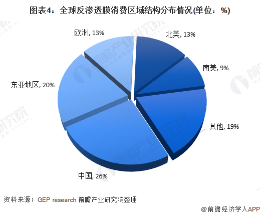 從消費(fèi)區(qū)域來看,中國是當(dāng)前最大的反滲透膜消費(fèi)國家。中國的消費(fèi)量占全球反滲透膜消費(fèi)量的比例為26%;其次是東亞地區(qū),反滲透膜消費(fèi)占比達(dá)到了20%;歐洲、北美和南美分別占比為13%、13%、9%。