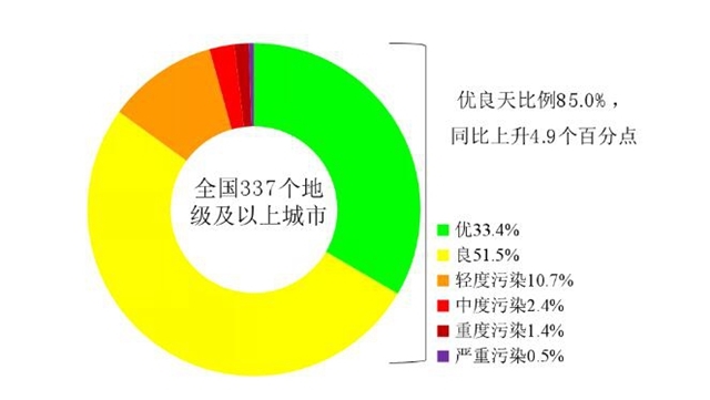 1-6月,全國337個地級及以上城市平均優(yōu)良天數(shù)比例為85.0%,同比上升4.9個百分點;PM2.5濃度為36微克/立方米,同比下降10.0%;PM10濃度為59微克/立方米,同比下降14.5%;O3濃度為141微克/立方米,同比下降1.4%;SO2濃度為10微克/立方米,同比下降16.7%;NO2濃度為23微克/立方米,同比下降14.8%;CO濃度為1.3毫克/立方米,同比下降13.3%。