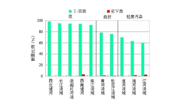 1-6月,長江、黃河、珠江、松花江、淮河、海河、遼河等七大流域及西北諸河、西南諸河和浙閩片河流Ⅰ-Ⅲ類水質(zhì)斷面比例為83.8%,同比上升5.9個百分點;劣Ⅴ類為0.7%,同比下降3.8個百分點。主要污染指標為化學(xué)需氧量、高錳酸鹽指數(shù)和五日生化需氧量。其中,西北諸河、長江流域、浙閩片河流、西南諸河和珠江流域水質(zhì)為優(yōu),黃河和松花江流域水質(zhì)良好,淮河、海河和遼河流域為輕度污染。