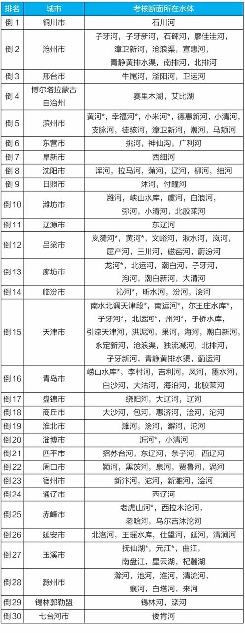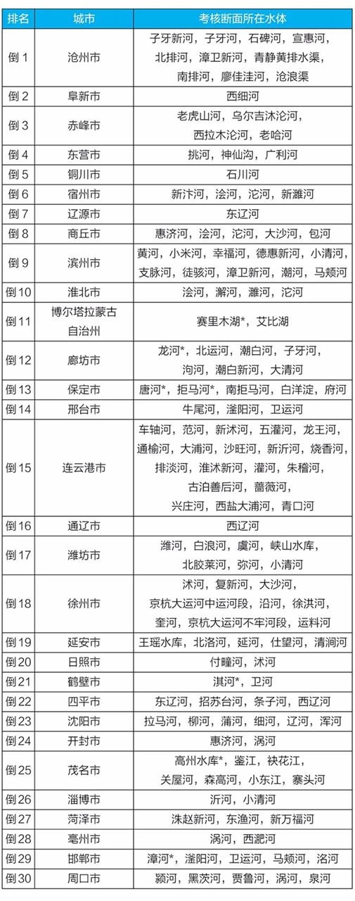 參加排名的全國地級及以上城市,覆蓋2050個國控斷面(其中1940個為國家地表水考核斷面,110個為入??刂茢嗝?。6月,全國地級及以上城市中,來賓、桂林和張掖等30個城市國家地表水考核斷面水環(huán)境質(zhì)量相對較好(從第1名至第30名),滄州、阜新和赤峰等30個城市國家地表水考核斷面水環(huán)境質(zhì)量相對較差(從倒數(shù)第1名至倒數(shù)第30名);1-6月,全國地級及以上城市中,張掖、金昌和柳州等30個城市國家地表水考核斷面水環(huán)境質(zhì)量相對較好(從第1名至第30名),銅川、滄州和邢臺等30個城市國家地表水考核斷面水環(huán)境質(zhì)量相對較差(從倒數(shù)第1名至倒數(shù)第30名);營口、呂梁和遼源等30個城市國家地表水考核斷面水環(huán)境質(zhì)量變化情況相對較好(從第1名至第30名),銅川、大慶和赤峰等30個城市國家地表水考核斷面水環(huán)境質(zhì)量變化情況相對較差(從倒數(shù)第1名至倒數(shù)第30名)。詳細見附表1~附表6。