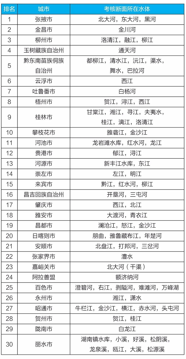 2020年1-6月國家地表水考核斷面水環(huán)境質(zhì)量狀況排名前30位城市及所在水體