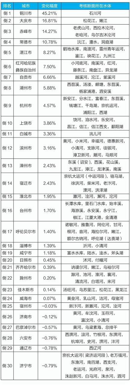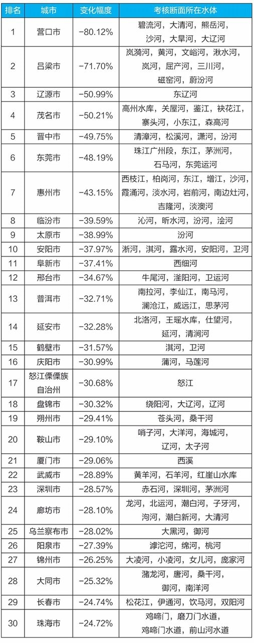 2020年1-6月國家地表水考核斷面水環(huán)境質(zhì)量變化情況排名前30位城市及所在水體