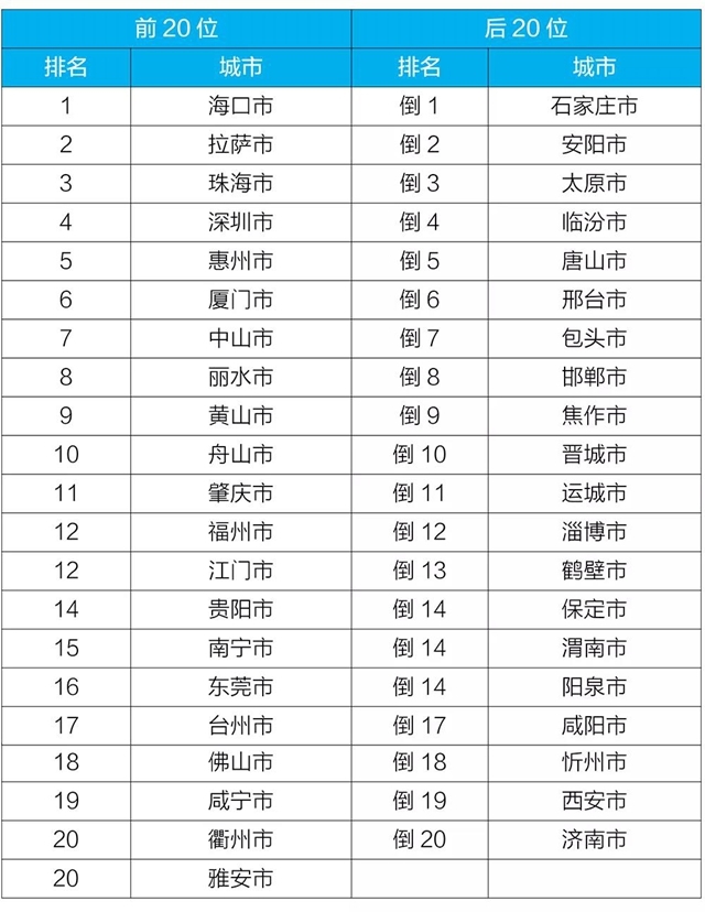 1-6月,168個重點城市中,石家莊、安陽和太原市等城市空氣質(zhì)量相對較差(從倒數(shù)第1名至倒數(shù)第20名);??凇⒗_、珠海市等城市空氣質(zhì)量相對較好(從第1名至并列第20名,見附表8)。