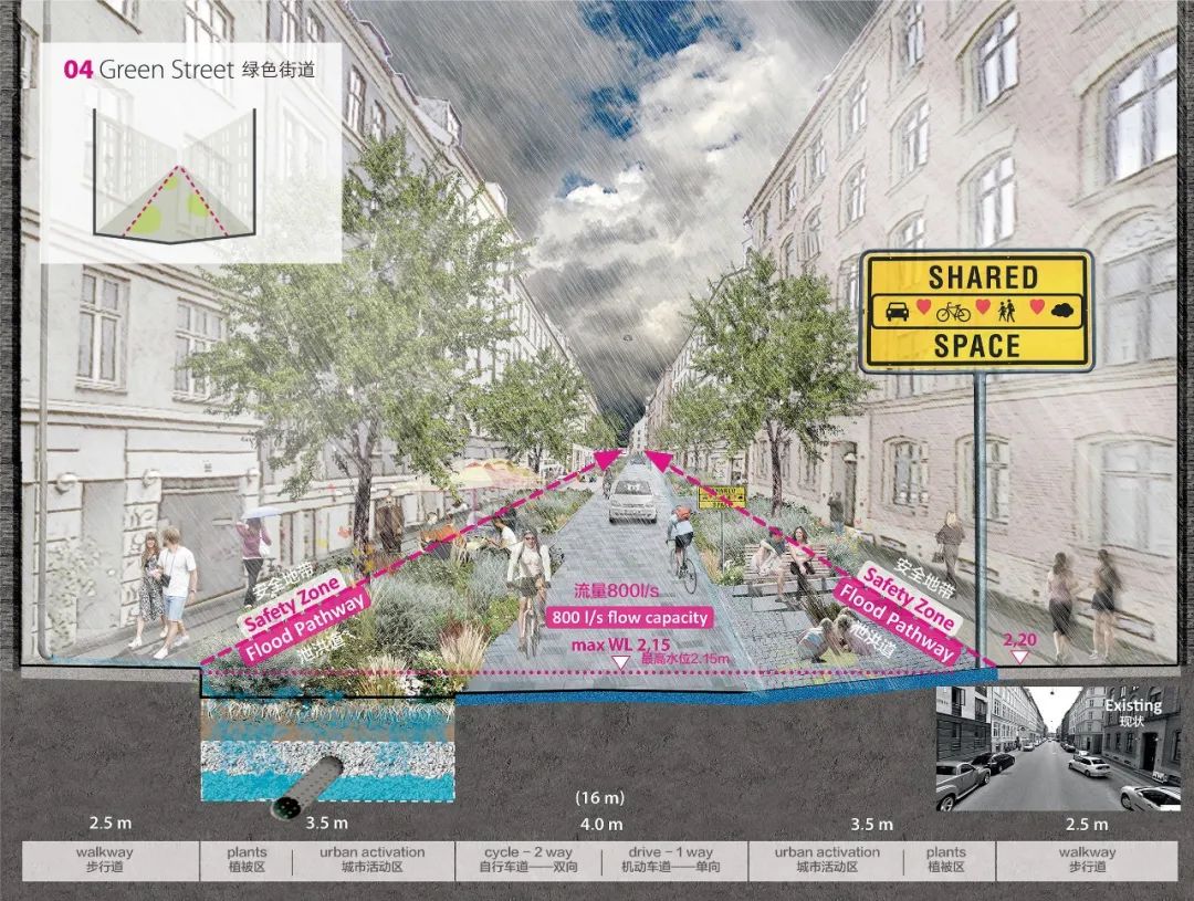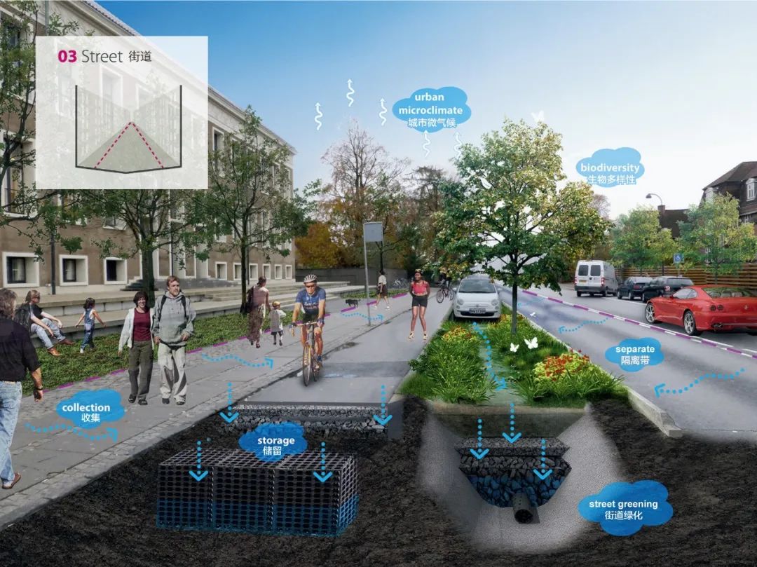 另一個用來緩解極端暴雨影響的具體策略是雨水滯留街道。這些街道通常是位于低洼、脆弱區(qū)域上游的次級道路,通過街道內(nèi)部的設(shè)計來創(chuàng)造巨大的蓄水空間。在不對交通產(chǎn)生重大妨礙的情況下,這些次級道路通??杀桓脑斐捎晁疁艚值?。通過增加洼地、透水鋪裝等方式實現(xiàn)對雨水的滯留,并可以凈化雨水,從而實現(xiàn)對地下含水層的補給。