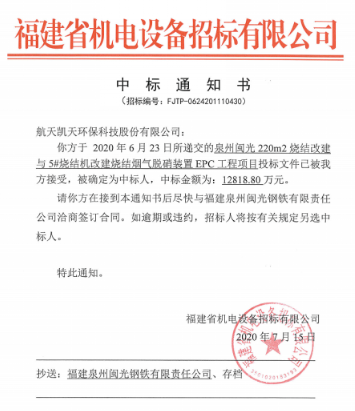 在6月到7月間,連續(xù)中標甘肅通渭縣生活垃圾處理系統設備采購項目、金鼎重工有限公司1#燒結機濕式電除塵器項目、金鼎重工有限公司白灰窯煙氣脫硝項目、福建三鋼閩光股份有限公司動力廠278th鍋爐煙氣增加SCR脫硝裝置及煙道換熱設備改造工程項目、泉州閩光220m²燒結改建與5#燒結機改建燒結煙氣脫硝裝置EPC工程項目、安陽市新普鋼鐵有限公司固定床脫硫脫硝改造SDS+布袋除塵燃煤氣鍋爐爐內SCR脫硝改造環(huán)保升級項目等6個項目,合計中標額1.95548億元,其中泉州閩光220m²燒結改建與5#燒結機改建燒結煙氣脫硝裝置EPC工程,中標金額12818.8萬元,刷新了航天凱天環(huán)保大氣環(huán)境治理業(yè)務單個合同金額,也為企業(yè)在鋼鐵行業(yè)煙氣治理領域再樹典型業(yè)績。
