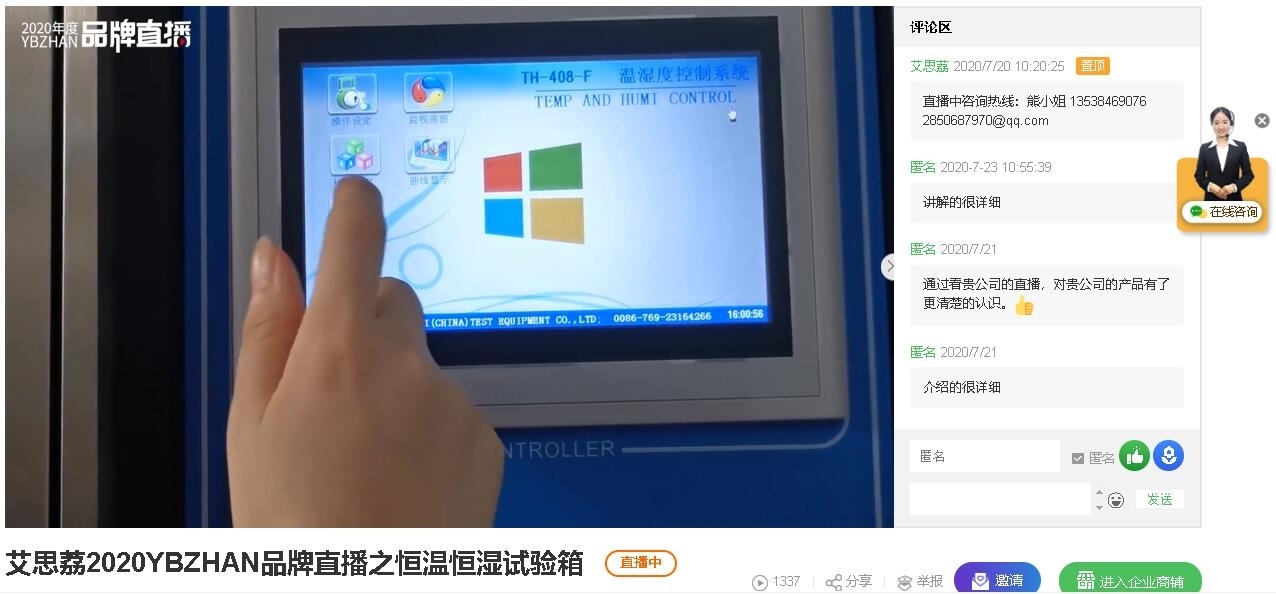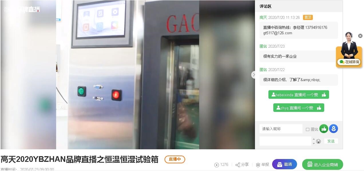 高天(←點擊進(jìn)入)直播間為大家?guī)砹斯局鳡I產(chǎn)品恒溫恒濕試驗箱和冷熱沖擊試驗箱的介紹。