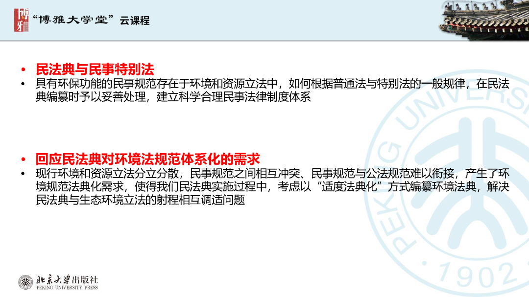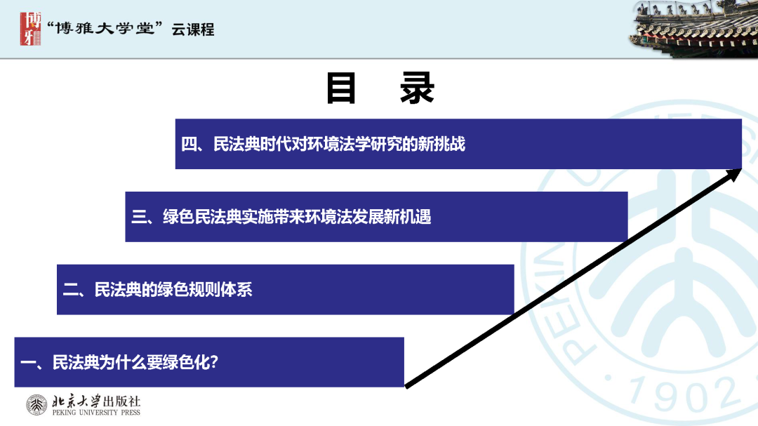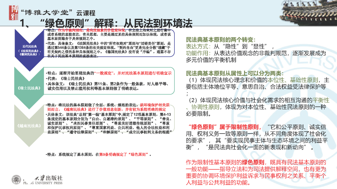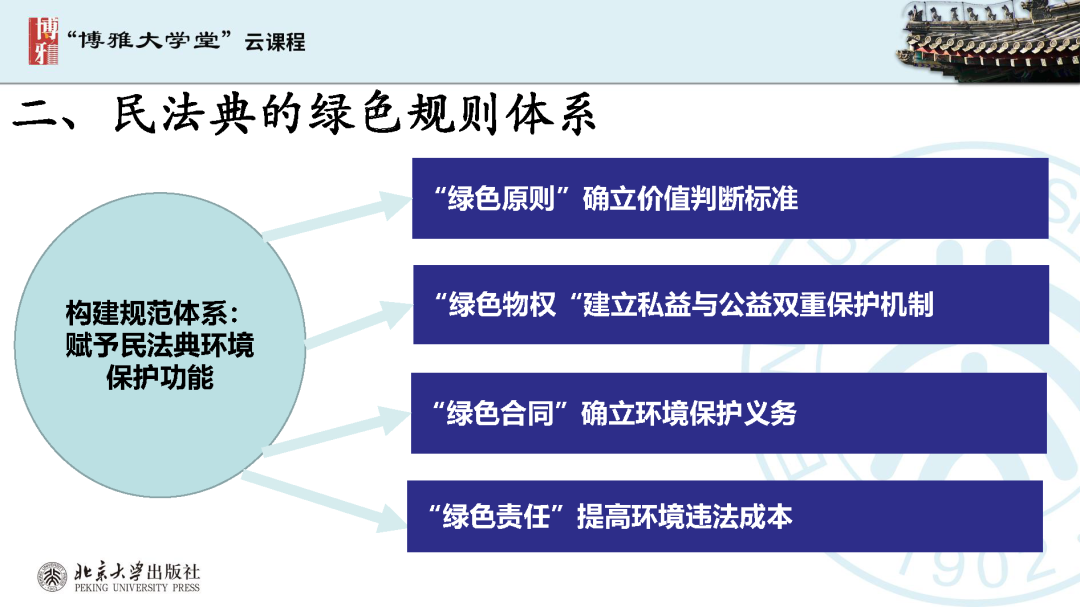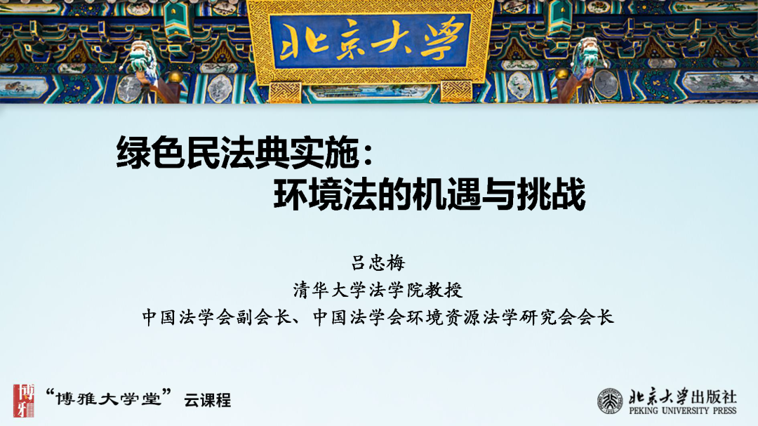 本文為?呂忠梅?老師在博雅大學(xué)堂上的報告。題目為《綠色民法典實施:環(huán)境法的機遇與挑戰(zhàn)》。內(nèi)容主要涉及民法典為什么要綠色化、民法典的綠色規(guī)則體系及綠色民法典給環(huán)境法帶來的新機遇和新挑戰(zhàn)。