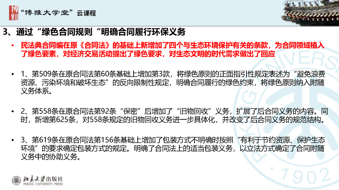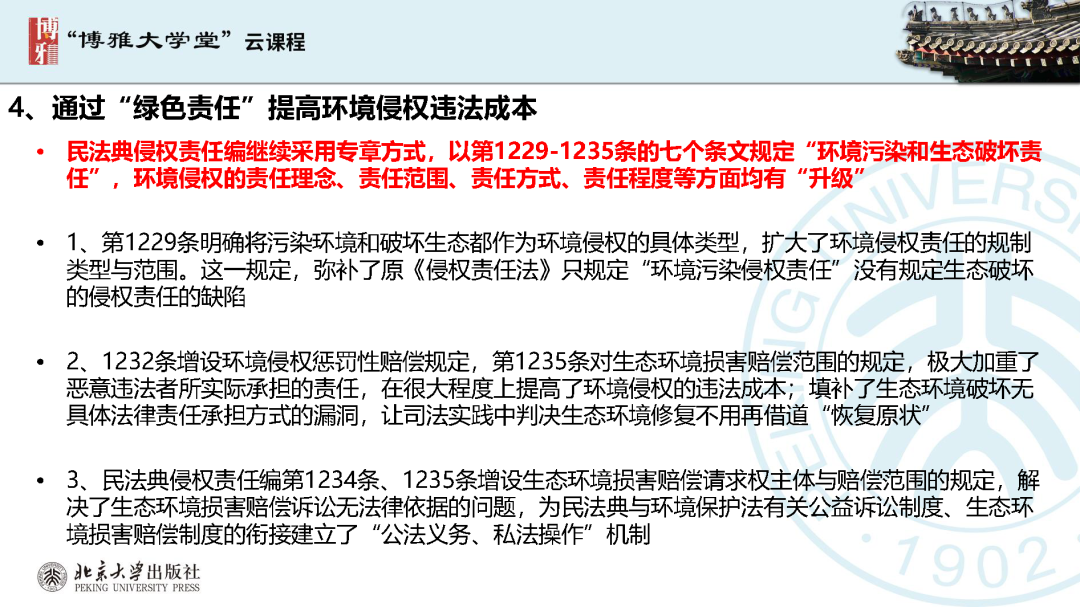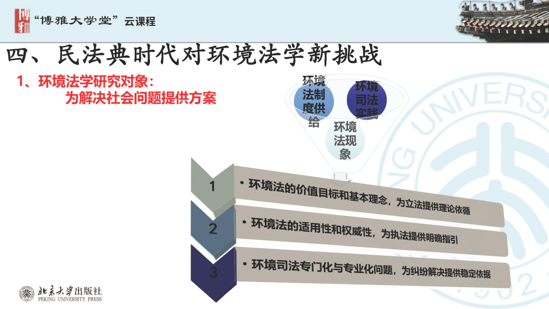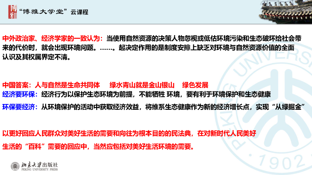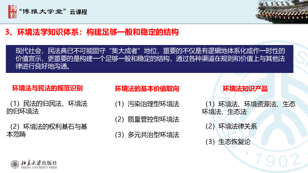 本文為?呂忠梅?老師在博雅大學(xué)堂上的報告。題目為《綠色民法典實施:環(huán)境法的機遇與挑戰(zhàn)》。內(nèi)容主要涉及民法典為什么要綠色化、民法典的綠色規(guī)則體系及綠色民法典給環(huán)境法帶來的新機遇和新挑戰(zhàn)。