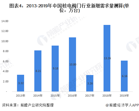 前瞻依照上述邏輯測算,2013年中國核電閥門需求量為3.32萬臺,其中2018年為近年最高,達(dá)到13.26萬臺。通過數(shù)據(jù)發(fā)現(xiàn),核電閥門需求量與中國核電投資額的變化基本一致,這也說明核電閥門新增需求行業(yè)發(fā)展嚴(yán)重依賴上游核電公司。