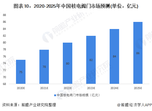 根據(jù)中國政府發(fā)布的十三五計(jì)劃和《中國能源中長期(2030~2050)發(fā)展戰(zhàn)略研究》,中國政府規(guī)劃以每年6-8座的速度新建核電站,并為引進(jìn)自主開發(fā)的新型核電站將投入共5000億元資金。依照過去十幾年中國核電建設(shè)速度來看,6-8座核電站(12-16個(gè)機(jī)組)顯然是不太現(xiàn)實(shí),前瞻假設(shè)以每年新建3座核電站計(jì)算,每座核電站裝配兩個(gè)機(jī)組(共6個(gè)機(jī)組),且每年3座核電站(6個(gè)機(jī)組)都在當(dāng)年年底之前投入運(yùn)營。通過對新增裝機(jī)部分需求和已運(yùn)營電機(jī)部分進(jìn)行計(jì)算,前瞻預(yù)測2025年中國核電閥門市場將會達(dá)到86億元。