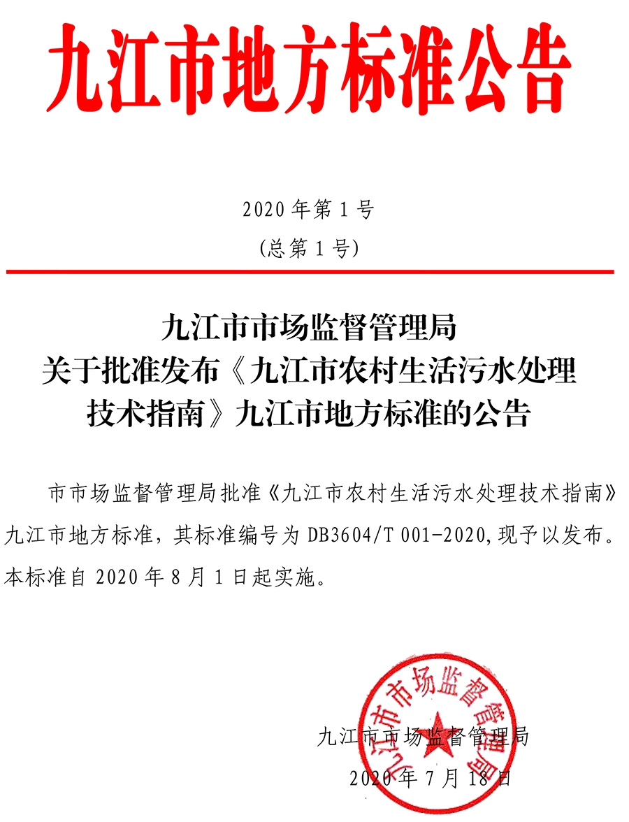 九江市市場監(jiān)督管理局關(guān)于批準發(fā)布《九江市農(nóng)村生活污水處理技術(shù)指南》九江市地方標準的公告