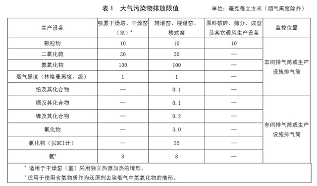 《排放標(biāo)準(zhǔn)》規(guī)定了陶瓷工業(yè)企業(yè)或生產(chǎn)設(shè)施的大氣污染物排放限值及控制要求、大氣污染物監(jiān)測、達(dá)標(biāo) 判定要求和實施與監(jiān)督。
