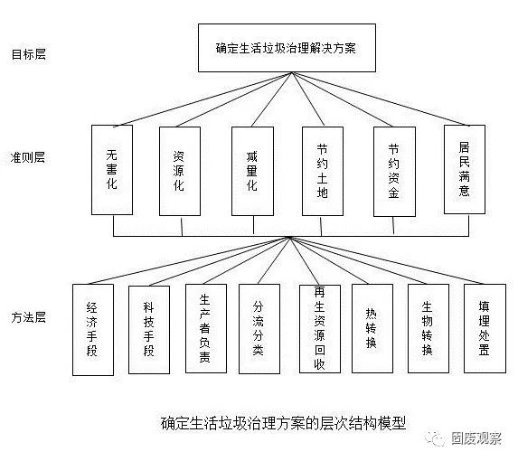 這種層次結(jié)構(gòu)模型表明生活垃圾治理方案的決策過(guò)程可以層次化,生活垃圾治理方案的決策是一個(gè)多準(zhǔn)則下多方法按優(yōu)先程度排序的多層次結(jié)構(gòu)分析問(wèn)題,可采用層次分析法,將決策問(wèn)題歸結(jié)為求解最低層(方案、措施、指標(biāo)等)相對(duì)于最高層(總目標(biāo))權(quán)重的數(shù)學(xué)問(wèn)題。具體思路是先分析各種治理方法相對(duì)于每個(gè)準(zhǔn)則的重要性,再結(jié)合本地政治、社會(huì)、經(jīng)濟(jì)情況,分析各個(gè)準(zhǔn)則的重要性,最后找到適合本地實(shí)際情況的治理方案。