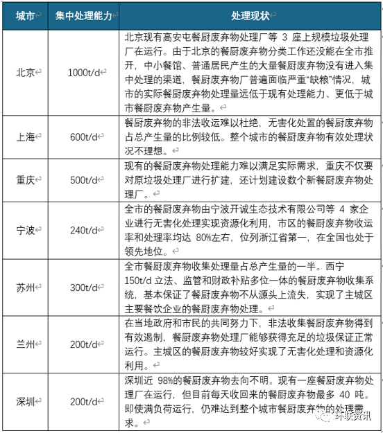 我國(guó)部分城市餐廚垃圾處理現(xiàn)狀