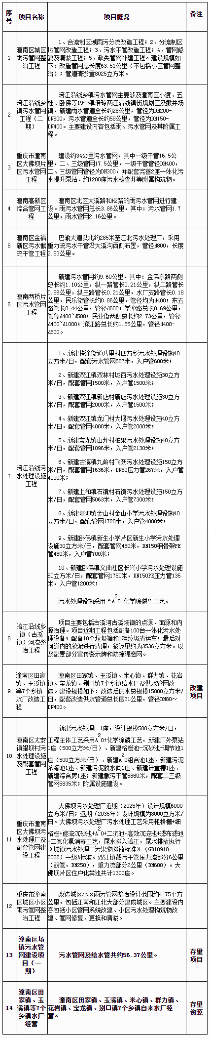 潼南區(qū)涪江流域水環(huán)境綜合治理PPP項(xiàng)目(一期)包括14個(gè)子項(xiàng)目,其中12個(gè)新改建子項(xiàng)工程和2個(gè)存量子項(xiàng)目;新改建子項(xiàng)目主要包括管網(wǎng)改造工程7個(gè)、污水處理設(shè)施工程3個(gè)、鄉(xiāng)鎮(zhèn)自來水廠改造工程1個(gè)、河流整治工程1個(gè);存量子項(xiàng)目為7個(gè)鄉(xiāng)鎮(zhèn)自來水廠經(jīng)營和潼南區(qū)場鎮(zhèn)污水管網(wǎng)建設(shè)項(xiàng)目(一期)。子項(xiàng)目概況見表1。