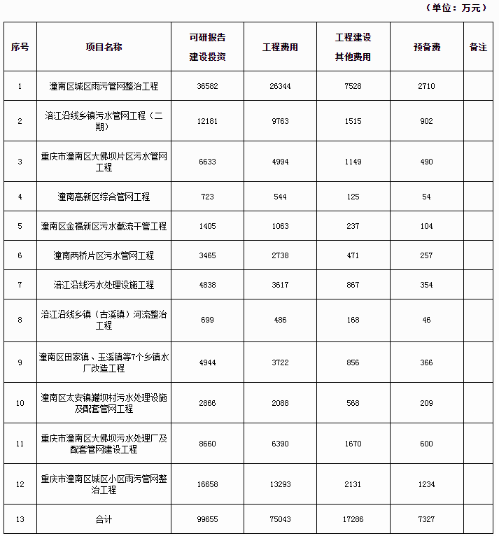 根據(jù)各子項(xiàng)目可行性研究報(bào)告批復(fù)文件和鄉(xiāng)鎮(zhèn)自來水廠經(jīng)營權(quán)評估報(bào)告、潼南區(qū)場鎮(zhèn)污水管網(wǎng)建設(shè)項(xiàng)目(一期)評估報(bào)告,本PPP項(xiàng)目建設(shè)投資(靜態(tài)投資)為116557萬元(其中:工程費(fèi)用75043萬元,工程建設(shè)其他費(fèi)17286萬元,預(yù)備費(fèi)7327萬元,7個(gè)鄉(xiāng)鎮(zhèn)自來水廠經(jīng)營權(quán)估值現(xiàn)值10365萬元,存量管網(wǎng)項(xiàng)目評估值6537萬元)。各工程項(xiàng)目投資估算統(tǒng)計(jì)如下表所述。