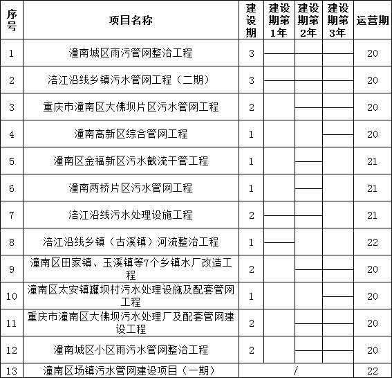 根據(jù)各子項(xiàng)目可研報(bào)告的實(shí)施進(jìn)度,確定本項(xiàng)目整體建設(shè)期為3年(各子項(xiàng)起始/結(jié)束時(shí)間不同,各子項(xiàng)目建設(shè)期為1-3年不等)。各子項(xiàng)目分別以各項(xiàng)目開工之日起計(jì)算建設(shè)期,由項(xiàng)目公司根據(jù)項(xiàng)目性質(zhì)及政府要求安排各子項(xiàng)目的建設(shè)進(jìn)度計(jì)劃。各子項(xiàng)目自試運(yùn)行合格或完工驗(yàn)收合格次日起即進(jìn)入運(yùn)營期,其中自來水廠項(xiàng)目、污水處理項(xiàng)目試運(yùn)行合格次日進(jìn)入運(yùn)營期,其它項(xiàng)目完工驗(yàn)收合格次日進(jìn)入運(yùn)營期;存量項(xiàng)目潼南區(qū)場鎮(zhèn)污水管網(wǎng)建設(shè)項(xiàng)目(一期)移交給項(xiàng)目公司后進(jìn)入運(yùn)營期。