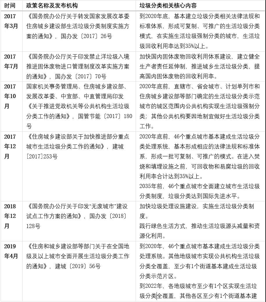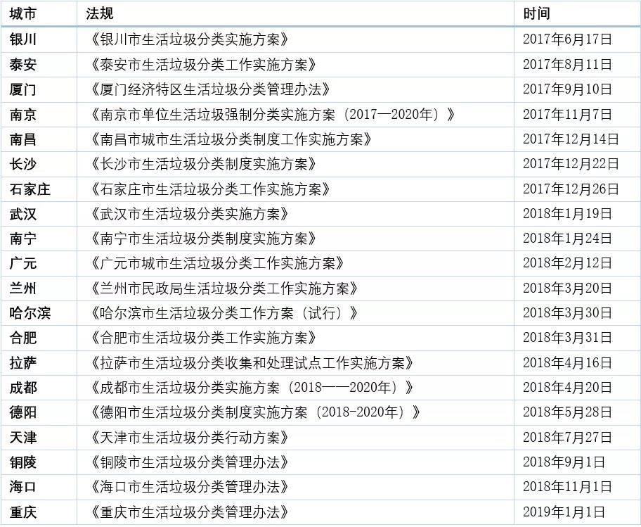 2017年底,住房城鄉(xiāng)建設(shè)部發(fā)布《關(guān)于加快推進(jìn)部分重點(diǎn)城市生活垃圾分類工作的通知》,要求2018年3月底前,46個(gè)重點(diǎn)城市要出臺(tái)生活垃圾分類管理實(shí)施方案或計(jì)劃行動(dòng),明確年度工作目標(biāo),量化工作任務(wù)。