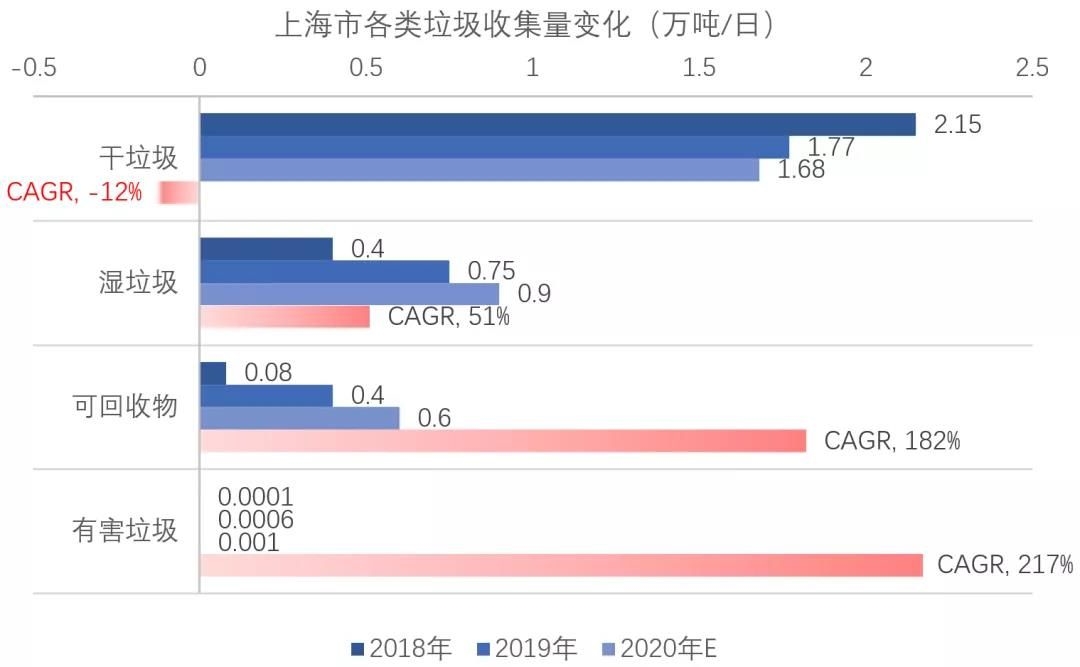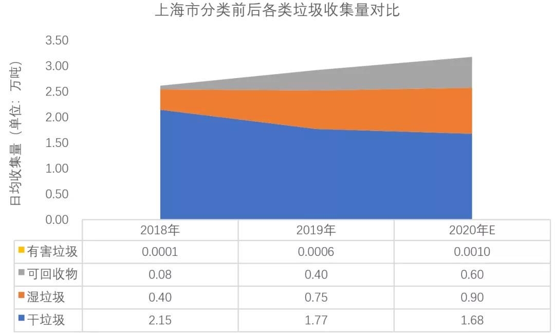 垃圾分類的效果在以上海為代表的部分城市已經(jīng)開(kāi)始有所體現(xiàn),可收集垃圾結(jié)構(gòu)發(fā)生明顯改變,濕垃圾(廚余垃圾)占比明顯提升并逐步穩(wěn)定:上海市在2019年7月1日正式實(shí)施強(qiáng)制分類之后,取得了顯著的成效,2019年1.3萬(wàn)余個(gè)居住區(qū)(村)垃圾分類達(dá)標(biāo)率由2018年年底的15%提高到90%,單位達(dá)標(biāo)率總體為87%。具體到各類垃圾來(lái)看,2019年,上海日均干垃圾處置量1.77萬(wàn)噸,濕垃圾分出量0.75萬(wàn)噸,可回收物0.40萬(wàn)噸,有害垃圾分出量0.6噸,同比分別減少17.5%,增加88.8%、431.8%和504.1%。