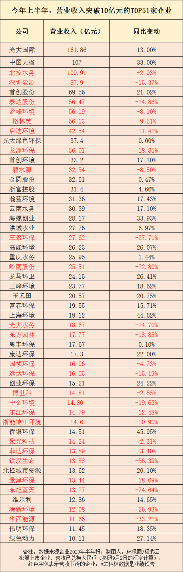 圖三:今年上半年營收突破10億元的TOP51家環(huán)保企業(yè)