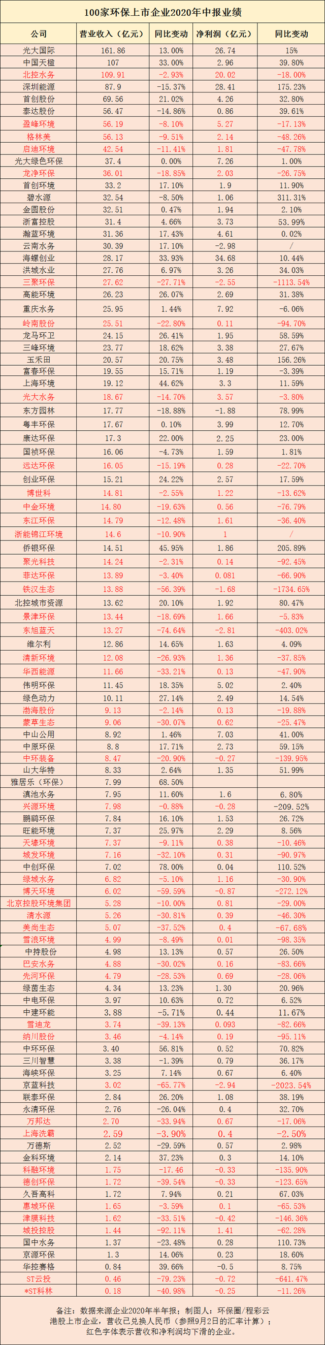附:100家環(huán)保上市企業(yè)2020年中報業(yè)績