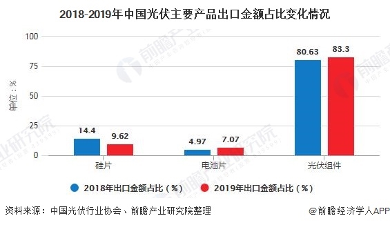 從出口金額來看,2019年,硅片、電池片、組件出口額分別為20億美元、14.7億美元、173.1億美元,除硅片出口額下降外,電池片、組件的出口額均同比大幅增長。光伏組件仍是主要光伏出口產(chǎn)品,2018-2019年,光伏組件出口金額占比均在80%以上。