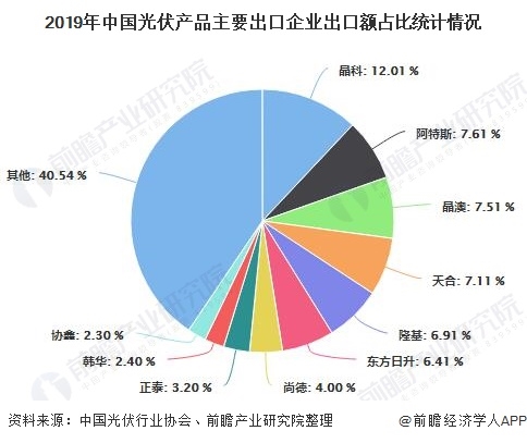 出口企業(yè)方面,出口前十企業(yè)的光伏產(chǎn)品出口額約為123.8億美元,占光伏產(chǎn)品出口總額的59.6%,較2018年下降2.2個百分點(diǎn)。出口額超過10億美元的企業(yè)達(dá)到6家,分別為晶科能源、阿特斯、晶澳科技、天合光能、隆基綠能、東方日升,較2018年增加2家。晶科能源以12.01%占比排名第一,阿特斯和晶澳科技緊隨其后,出口金額占比分別為7.61%和7.51%。