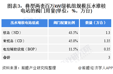 從中國(guó)核電機(jī)組的發(fā)展來(lái)看,核電閥門的需求量遠(yuǎn)高于同容量級(jí)的火電站。以容量為80萬(wàn)千瓦的核電站為例,通徑DN25-1000mm的閥門需求量為8000-10000臺(tái),為同類火電站的2-3倍。一座有2套百萬(wàn)kW級(jí)核電機(jī)組的核電站需各類閥門3萬(wàn)臺(tái),其中核島(NI)用閥門1.3萬(wàn)臺(tái),常規(guī)島(CI)用閥門1.35萬(wàn)臺(tái),電站輔助設(shè)施(BOP)用閥門0.35萬(wàn)臺(tái)。