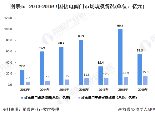而原有舊核電站的維修保養(yǎng)需求則是與已經(jīng)投入運(yùn)行中的核電站數(shù)量息息相關(guān),市場(chǎng)規(guī)模相對(duì)比較穩(wěn)定。2019年,中國(guó)核電閥門市場(chǎng)規(guī)模為55.3億元,其中核電閥門更新市場(chǎng)規(guī)模為15.9億元。