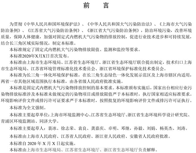 為貫徹落實(shí)《長(zhǎng)江三角洲區(qū)域一體化發(fā)展規(guī)劃綱要》,推進(jìn)長(zhǎng)三角生態(tài)綠色一體化發(fā)展示范區(qū)標(biāo)準(zhǔn)統(tǒng)一工作,上海市生態(tài)環(huán)境局、江蘇省生態(tài)環(huán)境廳、浙江省生態(tài)環(huán)境廳共同組織起草了固定式內(nèi)燃機(jī)大氣污染物排放標(biāo)準(zhǔn)(征求意見(jiàn)稿)。