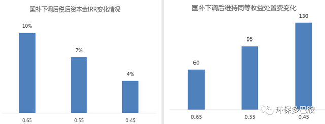 此次退補(bǔ),顯然將巨大影響項(xiàng)目收益。以一個(gè)1000噸/日項(xiàng)目為基準(zhǔn),按照補(bǔ)貼價(jià)60元/噸,0.65元/度補(bǔ)貼,其項(xiàng)目資本金稅后IRR為10.38%。如果國補(bǔ)取消0.1~0.2元,項(xiàng)目公司資本金稅后IRR將降低至4%~7%,顯然這無法滿足一般公司的投資需求。而若要維持同等收益,政府補(bǔ)貼需大幅上漲58%~116%(95元-130元/噸),一個(gè)項(xiàng)目政府每年需額外多付1100-2300萬元。