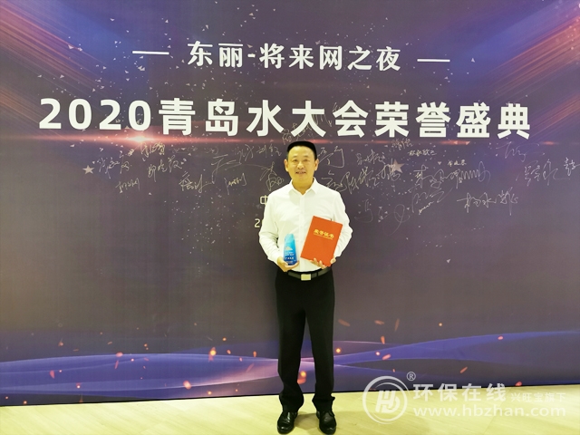 圖為本屆青島水大會(huì) 天創(chuàng)環(huán)境市場(chǎng)部總監(jiān)程志軍代表企業(yè)上臺(tái)獲獎(jiǎng)