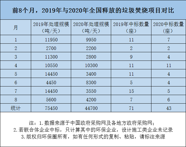 從定標(biāo)數(shù)量看,今年八個(gè)月,全國累計(jì)中標(biāo)了43座垃圾焚燒項(xiàng)目,相比去年的71座,也減少了28座,中標(biāo)數(shù)量也同比下降了40%。
