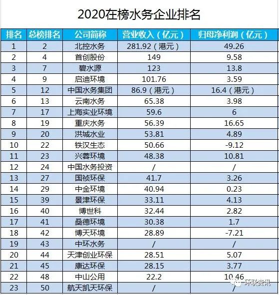 在榜水務(wù)企業(yè)中,北控水務(wù)、首創(chuàng)股份、碧水源、啟迪環(huán)境、中國水務(wù)集團位列前五。