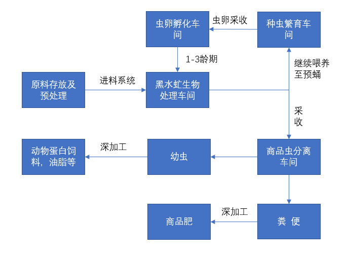 單就養(yǎng)殖技術(shù)來說,雖然控制有一定困難,但技術(shù)沒有多高的壁壘。再從大規(guī)模養(yǎng)殖的工程化角度來講,還有很多需要研究和優(yōu)化的地方。比如:整個養(yǎng)殖過程,涉及到的物料有餐廚垃圾、輔料、一齡期物料、蟲沙等,不同物料的臨時存儲、預(yù)處理、輸送、布料,都需要設(shè)計和考慮。預(yù)處理無機(jī)雜物的分揀,如玻璃、瓷器、塑料、餐具等,需要在一定程度上進(jìn)行考慮。物料的輸送和布料需要考慮,如何精準(zhǔn)的將物料輸送,并均勻平鋪到各個養(yǎng)殖層架上?又如何實現(xiàn)幼蟲和蟲糞的自動化分離?如何實現(xiàn)預(yù)蛹的自動化采收?當(dāng)然,純粹從技術(shù)角度來講,自動化問題也并非不可逾越,但是從商業(yè)角度,投資回報率也同樣重要,能否實現(xiàn)收益以及回報周期,才決定著投資的動力。從黑水虻的生長環(huán)境規(guī)劃上講,至少要分為原料及預(yù)處理車間、蟲卵孵化車間、幼蟲處理廢棄物車間、幼蟲分離車間、成蟲繁育車間等。黑水虻幼蟲需要在濕度60%,溫度28℃等條件下生長。成蟲需要在干燥環(huán)境并有縫隙處產(chǎn)卵,而且要根據(jù)蟲體的不同生長階段,對其進(jìn)行轉(zhuǎn)移。同時,因為代謝過程產(chǎn)物會以廢氣和水蒸氣排出,所以項目現(xiàn)場的除濕和換氣需要相關(guān)的設(shè)計和研究。這就需要從整體角度,對整個黑水虻養(yǎng)殖項目的廠房、物料的輸送轉(zhuǎn)運(yùn)、可能產(chǎn)生的二次污染的處理設(shè)施,進(jìn)行合理的規(guī)劃和布局。
